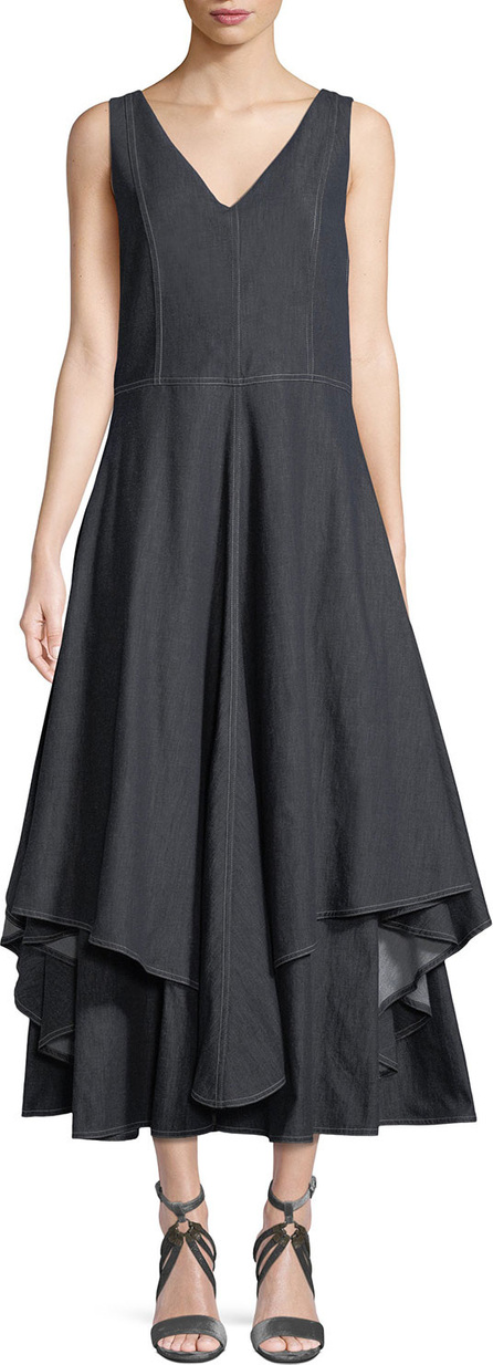 Brunello Cucinelli V-Neck Sleeveless Flounce-Hem Denim Dress w/ Contrast Stitching