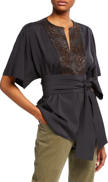 Brunello Cucinelli Sequin Floral-Embroidered Bibbed Kimono Blouse