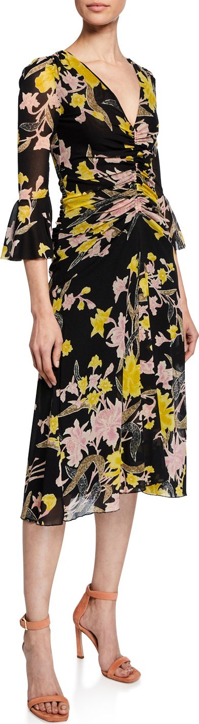 DIANE von FURSTENBERG Silas Ruched Bell-Sleeve Floral Dress