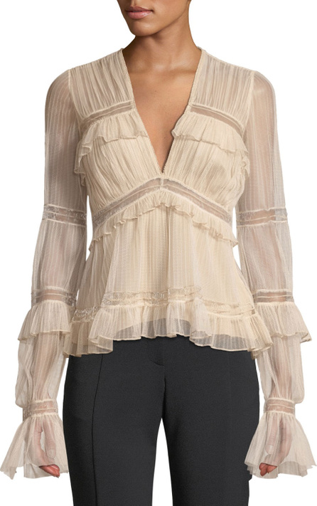 Jonathan Simkhai Plisse Tulle Plunging Long-Sleeve Ruffle Blouse